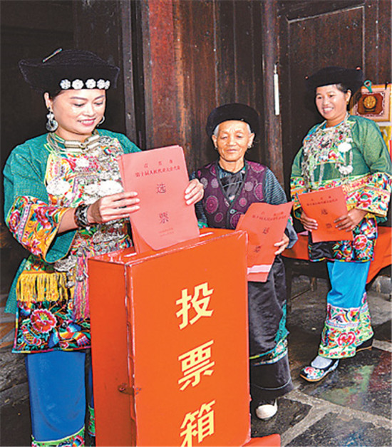 新一轮全国县乡两级人大换届选举涉及2850多个县(市、区)、32000多个乡镇,有9亿多选民参加,直接选举产生250多万名县乡两级人大代表,并在此基础上依法产生新一届县乡两级国家机关领导人员。图为2016年10月28日,苗家选民在湖南省吉首市己略乡第一选区龙舞村中心投票点进行投票。