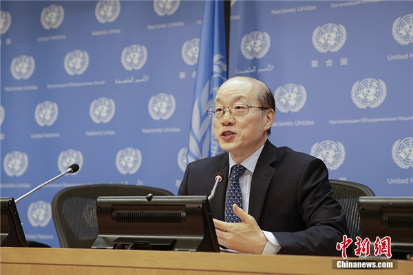 图为2017年7月3日,时任联合国安理会7月轮值主席、中国常驻联合国代表刘结一在纽约联合国总部主持安理会磋商。中新社记者 廖攀 摄