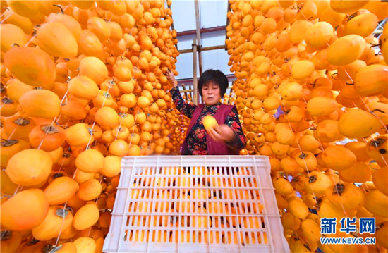 10月24日,山东省沂源县悦庄镇陈家官庄村的农民在翻晾吊晒的柿子。金秋时节,山东省沂源县5万亩柿子迎来收获季,农民们忙着采摘柿子、加工柿饼,一派红火忙碌的丰收景象。新华社发(赵东山 摄)