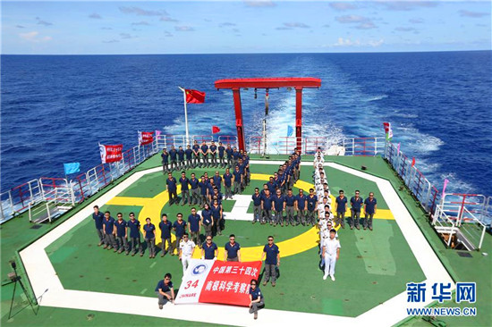11月15日,中国第34次南极科学考察队在“雪龙”号停机坪组成“34”字样的队形合影留念。