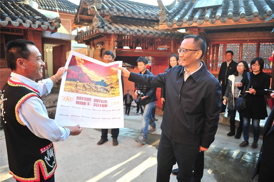 普洱市委书记卫星(右)给那柯里村民送绝版木刻印制的年画。供图