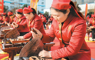 2016年12月17日,在安徽省亳州市,百名药工正在展示中药传统炮制技艺。