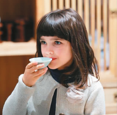 2016年11月12日,一名小女孩在德国法兰克福中国茶文化中心品茶。