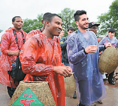 2016年4月16日,外国游客在安徽省庐江县茶文化园游览。