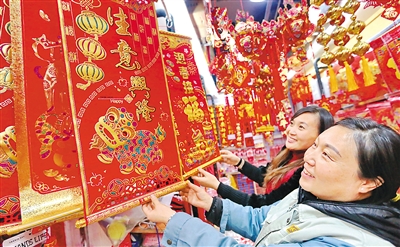 春节临近,许多店家门前张灯结彩,各种对联、灯笼、中国结、生肖、彩灯等春节年货进入销售黄金季,吸引着市民前来购置。图为1月3日,河北省秦皇岛市海港区建设大街四季青小商品城内,商家正在展示年货。