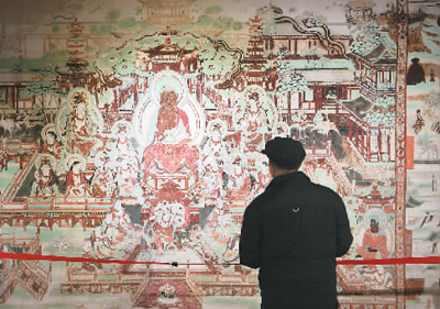 图为1月4日,参观者在敦煌艺术馆欣赏壁画。