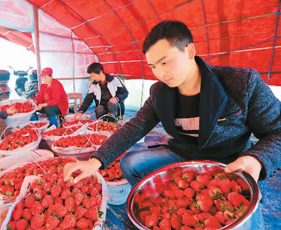 1月4日,安徽省庐江县汤池镇“草莓男孩”张杰正在自己的大棚里收获新鲜草莓。