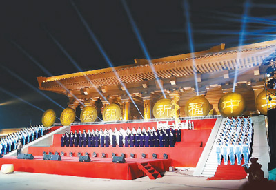 在悠扬激越的子长唢呐、威武雄壮的黄陵抬鼓方阵的衬托下,具有浓郁北方特色的火龙上下翻飞,陕北歌王、国家级非遗传承人王向荣,陕北民歌后起之秀延锦园等,共同演绎了陕北民歌《对花》。