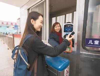 1月7日,一名武汉市民在武汉关轮渡码头通过扫码支付乘坐轮渡。