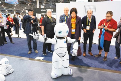 1月6日,在美国拉斯维加斯消费电子展上,参观者在一家中国企业的展位上观看一个接受语音指令进行各种舞蹈动作的机器人。