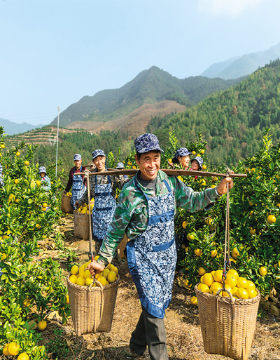 近年来,浙江省庆元县大力发展甜橘柚种植。图为农户在采收甜桔柚。