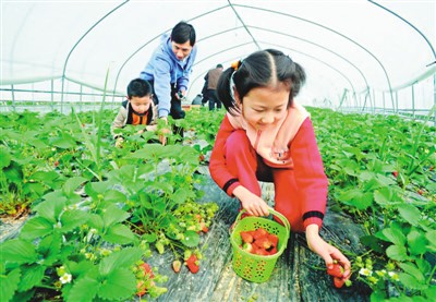 浙江省宁波市镇海区的一家草莓种植园中,游客正在采摘草莓。