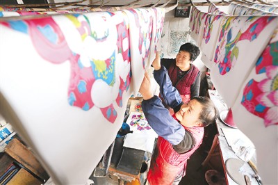 春节临近,素有“年画之乡”美誉的山东省潍坊市杨家埠村一片繁忙,村里的年画艺人们忙着赶印木版年画,供应各地市场。图为杨家埠村年画艺人晾晒刚印制好的木版年画。