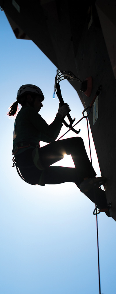 攀冰是一项挑战性很高的运动。运动员要手持冰镐,腰挂冰锥,脚踩冰爪,砸开冰壁把自己固定在岩壁上,找到合适的打点处把冰锥用力旋转,打入冰层并挂好安全绳,然后再脚蹬扣进冰壁的冰爪慢慢向上攀爬。