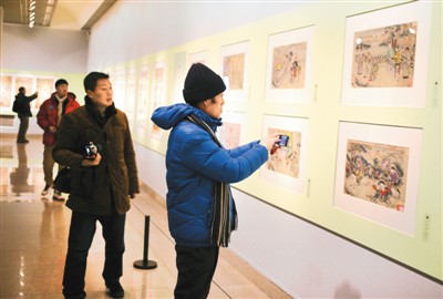 “杨柳春风——中国美术馆藏杨柳青古版年画精品展”近日在中国美术馆举办。该展甄选了百余幅杨柳青古版年画精品,其中不乏粉本和孤本。图为1月11日,观众在北京中国美术馆欣赏画展。