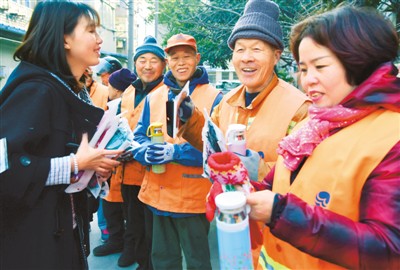 1月11日,江苏大学志愿者来到镇江市和平路街道金山社区,开展“关爱环卫工,寒冬送温暖”活动,向该社区辖区内的环卫工人赠送保温杯、手套、口罩等保暖用品,为“城市美容师”送上寒冬里的温暖。