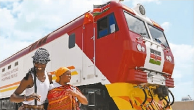 1月11日,由中企承建的蒙巴萨—内罗毕铁路项目首批6台货运机车运抵铁路起点肯尼亚的赖茨港站。图为当地民众在机车旁载歌载舞。