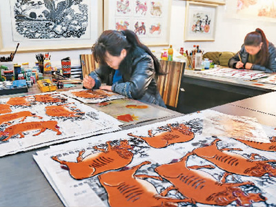 河北省蔚县剪纸是一种以阴刻为主、阳刻为辅的点彩剪纸,为国家级非物质文化遗产。近年来,河北蔚县在传承和保护剪纸艺术的同时,积极扶持剪纸产业化发展。目前该县剪纸从业人员3.8万人,全年生产剪纸600多万套,年产值2亿多元。图为1月14日蔚县南张庄村宏宇剪纸有限公司的工人在给剪纸染色。