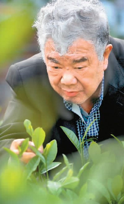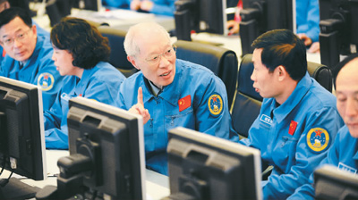 中国工程院院士、高级工程师谭述森(中)与同事一起研讨交流。