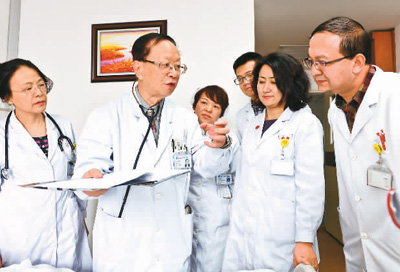 心血管病专家何秉贤(左二)与其他医生交流患者病情。