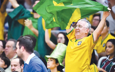图为2016年里约奥运会女子排球小组赛中,观看巴西队对阵俄罗斯队比赛的巴西球迷为巴西女排加油助威。
