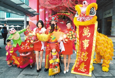 近日,香港春节氛围渐浓,到处可见喜庆的春节装饰。图为一购物中心在露天广场举行喜迎春节的活动,提前向人们送上新春祝福。