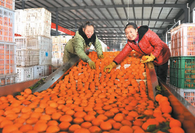 农历“小年”过后,位于三峡库区内的“中国脐橙之乡”湖北省秭归县迎来脐橙加工销售高峰。当地脐橙加工企业忙着清洗、分级、包装和销售脐橙,供应春节市场。图为工人在秭归县一家脐橙加工企业分拣脐橙鲜果。