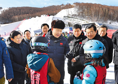 图为习近平在云顶滑雪场亲切勉励参加滑雪冬令营的少年儿童。