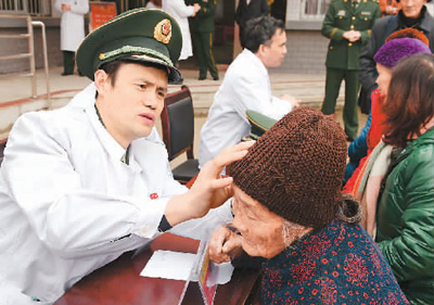 春节前夕,武警江西省总队扶贫小组来到赣州市定南县龙塘镇长富村,开展新春走基层扶贫义诊活动。他们走访慰问了59户军烈属、退伍军人、孤寡老人和困难群众家庭,并送去生活用品和慰问金。图为医务人员为村民体检。
