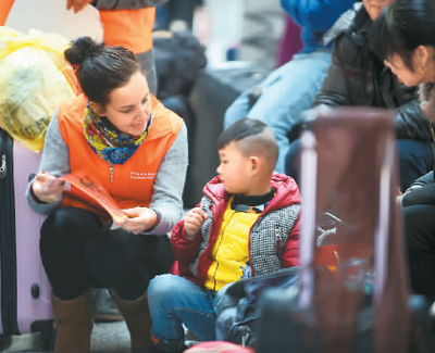 1月23日,5位在杭州工作、学习,分别来自澳大利亚、英国、加拿大和坦桑尼亚等国家的外籍志愿者,来到杭州火车东站,和当地志愿者一起参加名为“温暖回家路”的春运志愿服务。图为来自英国的志愿者蕾切尔(左一)和一名小朋友聊天。