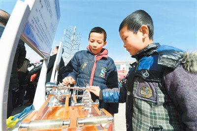 1月23日,甘肃兰州市城关区伏龙坪街道二营村迎来当地政府部门组织的文化科技卫生“三下乡”活动。图为两名儿童在“三下乡”活动上体验科普实验。
