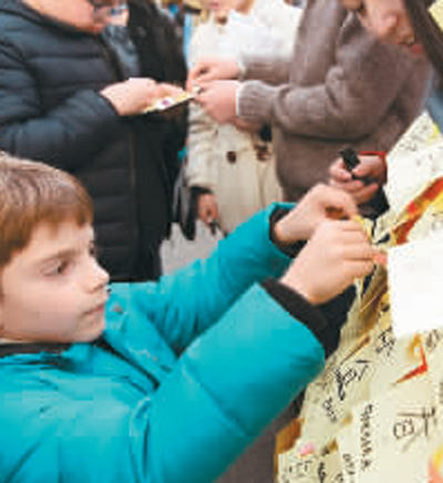 2016年1月30日,在意大利罗马中国文化庙会上,一名意大利男孩将自己用中文写的“春”字贴在展板上。