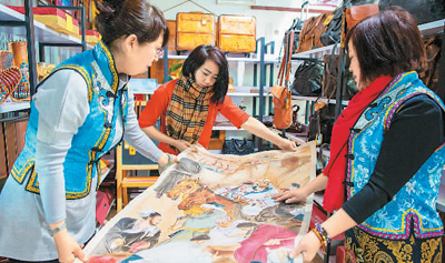 春节临近,集旅游商贸、文化创意于一体的内蒙古呼和浩特市玉泉区大召文化产业群落内热闹非凡,种类丰富的节庆用品、民族工艺品、创意产品等吸引众多市民前来办年货、寻年味。图为市民在选购皮画。