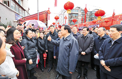 图为李克强在昭通年货集市考察节日市场供需与食品安全情况。