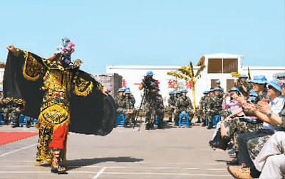 在南苏丹的春节联欢会上,维和战士在表演川剧变脸。