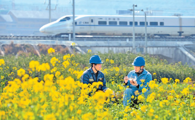 图为贵州从江县两名巡线工在巡视贵广高铁线的间隙,在油菜田边吃午餐。