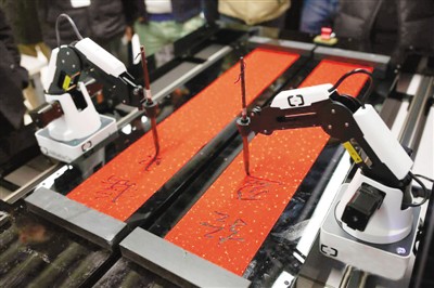 日前,在位于浙江省杭州市的阿里巴巴西溪园区,阿里云人工智能书法机器人现场为员工书写春联。活动现场,人们可以通过唤醒机器人,与其对话,再经过人脸识别和语音分析等功能,由机器人书写一幅个人专属春联。