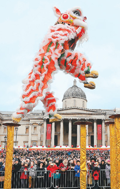 日前, 英国伦敦的特拉法加广场举行“文化中国·四海同春”文艺汇演,庆祝中国农历鸡年春节。