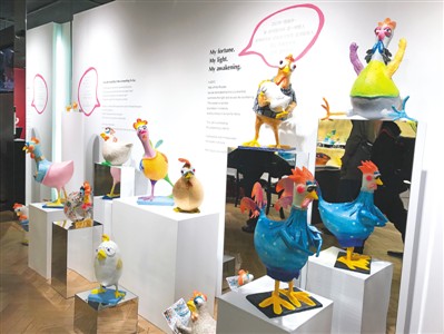 图为美国南加州“琉璃工房”艺廊里展出鸡年特色作品。