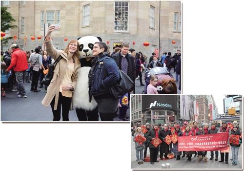 此外,纽约等地华人华侨也自发组织多场活动,热烈庆祝中国农历春节。1月29日,布鲁克林华人联合会举办的新春舞狮贺岁游行人山人海,礼花摊、棉花糖等小商小贩目不暇接,热闹程度不输国内庙会。纽约中华公所举办的春节庆祝大会、美华艺术协会组织的京剧专场演出、长岛大颈华人协会举办的春节联欢晚会、佛光山纽约道场举办的新春礼千佛法会等活动也热闹非凡。在著名的地标性建筑——时代广场,来自江苏省的书法家与美国艺术家一道展示中国春联、福字等春节民俗。