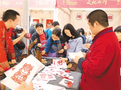 香港市民在非遗摊位前挑选剪纸。