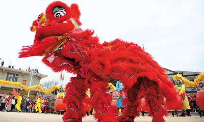 春节期间,江西省万载县举行“民俗大戏迎新春”展示活动。图为当地群众在表演舞狮。