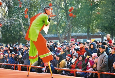 一月三十一日,北京市民在龙潭庙会上观看民俗传统花会表演。