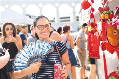 1月28日,“欢乐春节”系列活动在巴西里约热内卢市拉帕景区继续进行。拉帕广场上摆起中国小吃、书法等摊位,俨然一场“中国庙会”,吸引了不少里约当地人前来感受中国文化。图为一名巴西人在拉帕景区展示刚刚购买的扇子。