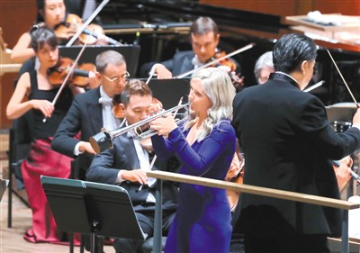 1月31日,纽约爱乐乐团中国新年音乐会在美国林肯中心大卫·葛芬音乐厅向当地观众奉献了一场中西合璧的艺术盛宴。这是纽约爱乐乐团连续第六年举办中国新年庆典。图为小号演奏家艾莉森·巴尔松(前左)演奏旅法华人作曲家陈其钢的小号协奏曲《万年欢》。