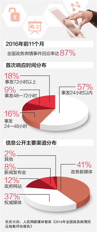 统计显示,中国目前拥有政府网站超过8万家,不少党政机关还开通了微博、微信、客户端,截至2016年12月,经过认证的政务微博达到164522个,较2015年底增长8.0%。其中政府机构微博125098个,公职人员微博39424个。
