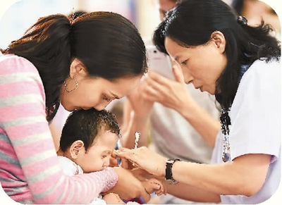2016年9月19日,在黑龙江中医大二院的康复中心,来自哈萨克斯坦的热尼娜抱着孩子阿尔斯兰接受中医康复治疗。