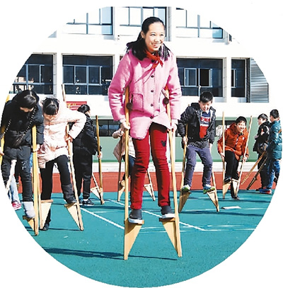 春节期间,浙江省建德市新安江第一小学学生参加踩高跷活动。