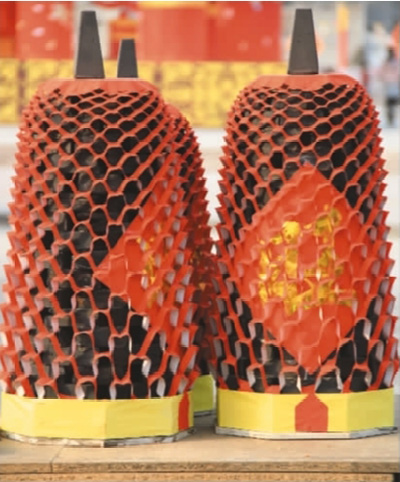 简单来说,“旺火”就是用煤炭砖垒出的“小房子”。“房子”的每一层各个方向都留有气口,点燃后,火焰从里面喷射而出,借火势上冲,远远看去,像一座燃烧的舍利塔。“旺火”小则半米高,大的有二十几米高。当地人又称其为“发旺火”,取来年兴旺发达之意。发着了“旺火”,全家人都要围着它转三圈,并且带出新年的衣服烘烤,以求来年好运。