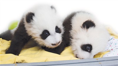 美国亚特兰大动物园的大熊猫双胞胎“雅伦”(右)和“喜伦”。